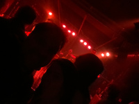 Ich bestelle alkfreies Bier an der Theke, worauf sich ein älterer glatzköpfiger Oiler kopfschüttelnd abwendet…ich und Oi, das wird nix mehr in diesem Leben LEISTUNGSTRÄGER sollen um 20:30 Uhr anfangen - und die will ich ja sehen. Viel zu früh, was ist nur aus Punk geworden? Muss dran liegen dass es sich, wie ich später am Publikum merke, um überalterten Gröldeutschpunk handelt. Ich werde per Signal-Liveticker in der U-Bahn von meiner Band über den aktuellen Status vor der Bühne unterrichtet. Bei den Worten "Benni betritt die Bühne" erklimme ich die Ausgangsstufen des U-Bahnhofes und sprinte los. Beim Eintritt kurz nach dem 1. Song bietet sich mir dieses Bild vom hinteren Saalende. Außer mir sind wohl alle pünktlich und lauschen durchaus interessiert.