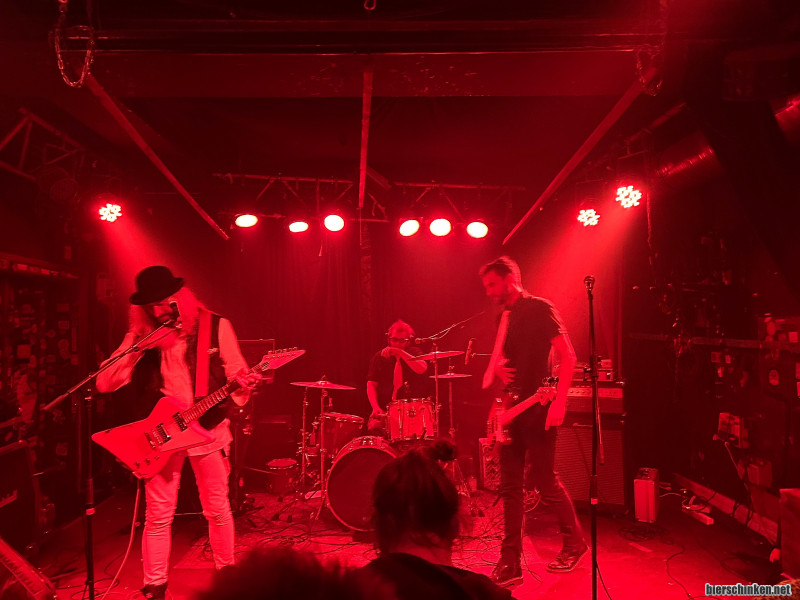 Paula: Hier mein letztes Bandbild. Ansagepause oder so. Leistungsträger in Bewegung. Aber hier ist auch Basser Benni, der u.a. auch bei Moloch spielt (Benjamin Kasso! Wir wollen ja beim Bandkonzept bleiben...), in Hemd und Krawatte mit drauf. Das Bandkonzept, sei hier nochmal hervorgehoben, ist im Gesamtbild übrigens groß. Hört euch mal die Platte mit den Texten an! Deutschpunkgeballer mit Working-Class-Hero-/Kaptialismuskritik-Persiflage. Dann checkste auch die Ansagen. Ob das beim überalterten HASS-Publikum so ganz gezündet hat, wage ich zu bezweifeln. Aber mensch applaudiert ordentlich und fordert am Ende sogar Zugaben!