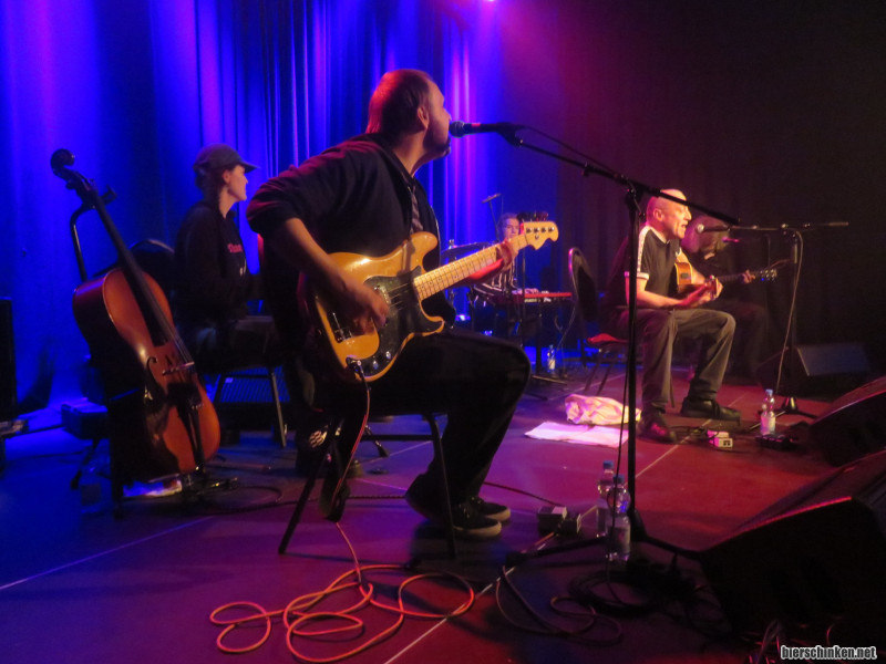 Fö: Snuff haben kürzlich ein Akustik-Album rausgebracht, das habe ich gar nicht mitbekommen oder ignoriert. Die Besetzung aber eigentlich, soweit man das bei dieser Band beurteilen kann, ist die aktuelle Bandbesetzung inklusive Saxophonistin Flo Redmonds, die aber heute Cello spielt. Und Duncan hat das Schlagzeug verlassen, um vorne die Akustikgitarre zu bedienen. Also alles ein wenig bunter gemischt! Weitere Besonderheit: Duncans Stimme ist heute etwas angeschlagen, weswegen die Backings von Bassist Dan etwas mehr in den Vordergrund kommen.