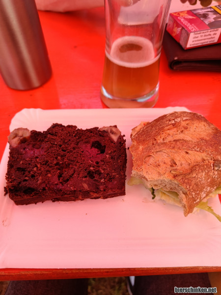 alexanderdavide: Es schlägt 9 Uhr, also ab zum Festivalfrühstück. Heute schiebe ich mir ein belegtes Baguette mit Hummus und einen veganen Schoko-Bananen-Kuchen rein. Das Weizen schmeckt auch schon wieder. Währenddessen spielt JAYDEE Klassiker des Punk Rocks und moderiert ein Open Mic, wo es den ein oder anderen Gastauftritt gibt.