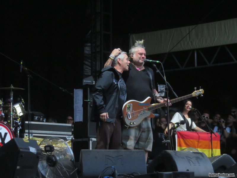 Fö: Mit viel gutem Zureden wird zwischendurch sogar Dave Pollack auf die Bühne gerufen! Der Chef von Destiny Tourbooking wird zwar eher für andere Qualitäten gelobt, dürfte aber maßgeblich für den Erfolg von NoFX hier in Deutschland verantwortlich sein, hat er doch 1989(!) angefangen, die Band zu buchen. Stark. Applaus dafür!