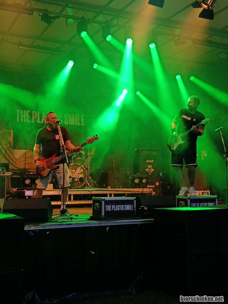 The Plastic Smile aus Stuttgart blickt ebenso auf eine lange Bandgeschichte zurück: 1994 als "Scrambled Eggs" gegründet, benannte sich die Gruppe 2010 in den heutigen Namen um. Bemerkenswert ist, dass die klassische Dreierbesetzung noch immer aus den Gründungsmitgliedern besteht und es auch keine Wechsel zwischendrin gab. Erst im März 2024 hat die Band ein neues Album veröffentlicht, weswegen ich gespannt bin, eine Kostprobe live und in Farbe zu bekommen. Ein paar ältere Gassenhauer werden ebenfalls zum Besten gegeben, was ich mit Freude annehme. Genauso glücklich bin ich über die Wetterlage, denn wir haben einen wunderbar warmen Sommerabend während parallel das Fußballspiel Dänemark gegen Deutschland im Regen absauft. Das wird tatsächlich auf einem TV gezeigt, der neben der Bühne platziert ist, sodass einige Besucher mehr Fußball als Band schauen. Ich würde es ohne Glotze besser finden, selbst wenn manche dann gehen würden.