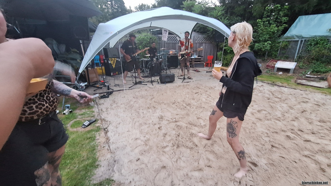maks: Restlos begeistert ist die "Chefin" offenbar auch, hier beim Spontanauftritt von 3/5-Fucking Angry, die 3-4 Songs zum besten geben. Chris übernimmt den Gesang für die abwesende Beckx und hat durchaus eine ebenfalls herzergreifende Stimme.