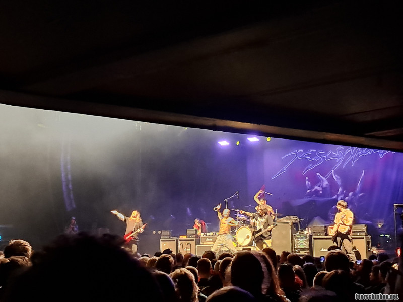 Erste Band ist JESUS PIECE. Wir sind viel zu sehr damit beschäftigt, uns zwischen die Menschenmassen zu schieben, um die Stationen Klo, Bar und Garderobe zu schaffen, als uns mit der Musik zu beschäftigen. Es wird auf jeden Fall fleißig gegrunzt, also auf der Bühne. Was bleibt ist: "No shirt, no merch!"