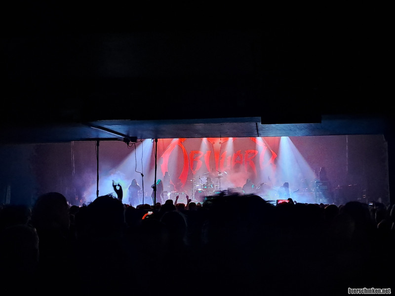 Als nächstes dann OBITUARY. Jemand hatte mir zu Schulzeiten mal die "World Demise" ausgeliehen, und ich konnte mal so gar nichts damit anfangen. Aber jetzt, so ein paar Jahre später, bin ich bereit, amtlich angeschrien zu werden und finde es schön, so eine Art Flashback zu haben. Alleine schon der Blick aufs Bandlogo katapultiert mich in alte Metal-Hammer-Zeiten zurück.