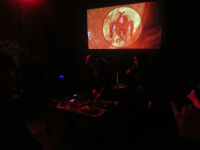 Okay, so gerüstet geht es weiter mit COMA CLUSTER. Auch hier ist wieder der Tisch das tragende Element sowie ein Sammelsurium an Drehknöppen. Außerdem eine Leinwand hinter dem Duo, auf der passende Bilder projiziert werden. Ich bilde mir sogar ein, dass die Projektion auf die dargebotenen Geräusche abgestimmt ist, was auch wieder faszinierend ist. Das hieße ja, dass hier nicht einfach nur wahllos Geräusche fabriziert werden, sondern wir es mit ausgearbeiteten Songstrukturen zu tun haben. Einfach unfassbar!