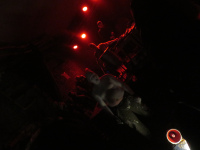 Wieder nähe Bühne angekommen, greift besagte krabbelnde Frontperson einen Menschen aus dem Publikum am Kragen und zieht diesen zu Boden. Dieser lässt sich auf die Rangelei