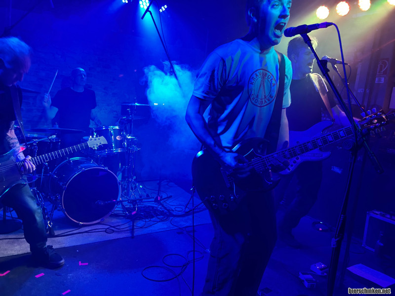 Diesmal bin ich aber auch so schlau, mir den ersten Eindruck das erste Bier trinkend vom hinteren Treppenabsatz zu gönnen. Lage sondieren, Überblick verschaffen. Der Sound ist gut, vor mir eine leicht mitwippende Menschenmauer.