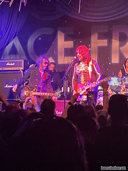 Zum Abschluss holt Ace Frehley seinen Wegbegleiter Richie Scarlet auf die Bühne. Dieser spielte u.A. auf Aces Soloalbum TROUBLE WALKIN' mit und oh boy ist das ein abgerockter Dude. Danke Richie Scarlet dass ich jetzt weiß wie es aussehen würde wenn ich meine spärliche Haarpracht bis zur Schulter wachsen lassen würde. Aber genug Lookismus, Ageism und Bodyshaming, der Spaß kommt mit Scarlet noch einmal auf die Bühne! Gemeinsam mit allen Beteiligten und dem Publikum wird "Rock'n Roll All Nite" abgefeiert. Ich habe nun endgültig keine Stimme mehr.
