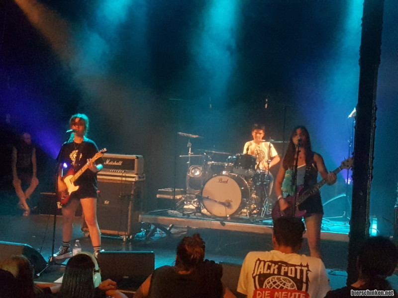 Professionelles Set, kreatives Schlagzeugspiel und super Stimme. Außerdem ein lilaglitzerner Bass (und gute Basslines). Grungepoppunkig à la carte. Da lohnt es sich nochmal nachzuhören, um erste Assoziationen mit THE DISTILLERS, HOLE, THE MUFFS, BAD COP/BAD COP und anderen zu überprüfen.