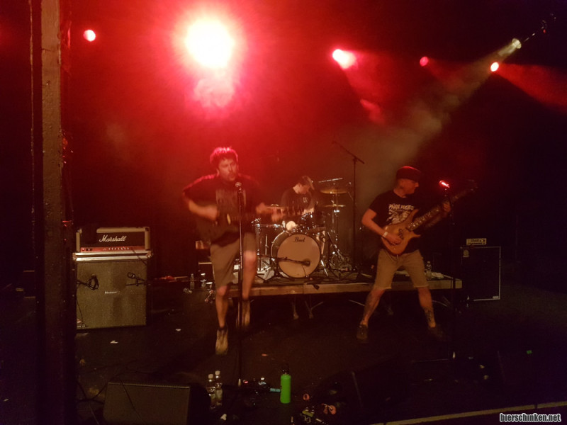 Vor der Bühne gesellt sich mit einem Mal ein Hai zum letzten Rest, für den die Band nochmal alles gibt. Als ich einen Blick zwischen die Zähne erhasche, entdecke ich unter dem Kostüm die Reste von geschminkten Waschbäraugen. Wie schon erwähnt, sind sich die Bands auf diesem Festival wohlgesonnen und so schaut sich Stza als Hai verkleidet die Show von BOSS' DAUGHTER in vorderster Reihe mit uns übrigen begeistert an.