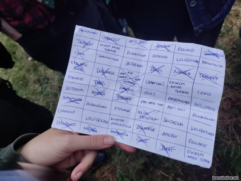 Beim inoffiziellen Shirt- und Patchbingo wurde derweil gehadert, dass zu viel Extreme Noise Terror auf dem Zettel landete. Bei Festivals mit vielen beschissenen Bands klaue ich mir vielleicht die Idee damit keine Langeweile aufkommt.