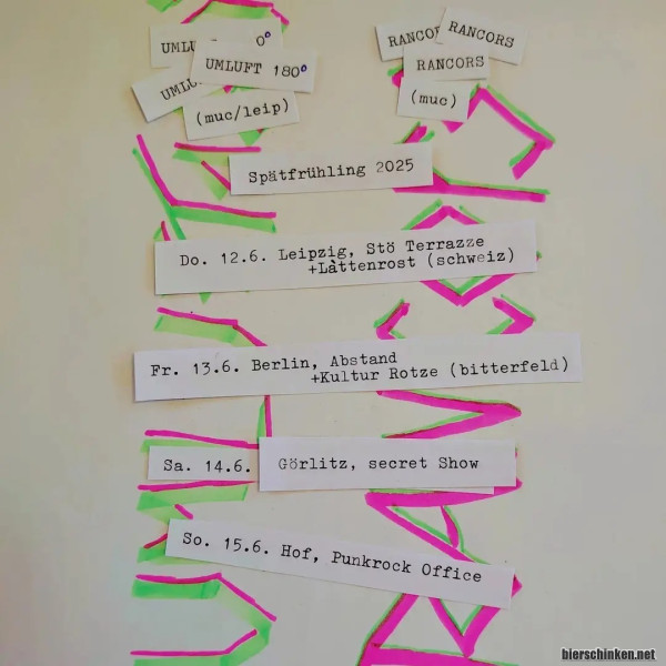verSemmelt: 14.06. Heut geht es mal wieder zu "AskAPunk" nach Görlitz,wo schon Leute durch den autonomen Beautysalon mit den Worten "Frage nicht" verschönert wurden. Ich verpasse den ersten Auftritt von CUR entweder wegen Heu reinholen, oder Autowäsche wegen Konfirmation. So richtig sicher bin ich mir nicht. Dann gibt´s UMLUFT 180°, die direkt mit Schleim-Keim beginnen und insgesamt gut drauf sind, aber es fast etwas schwer haben bei so DIY-HC-Punk Publikum. Danach DERRUMBE aus Berlin mit einem Crustpunkgewitter ohne Pause. Sänger dreht gut vor der Bühne ab. Highlight. RANCORS dann zum Abschluss mit irgendwie Straßenpunk und 3 sehr unterschiedlichen Gesangsstimmen. Gefiel.