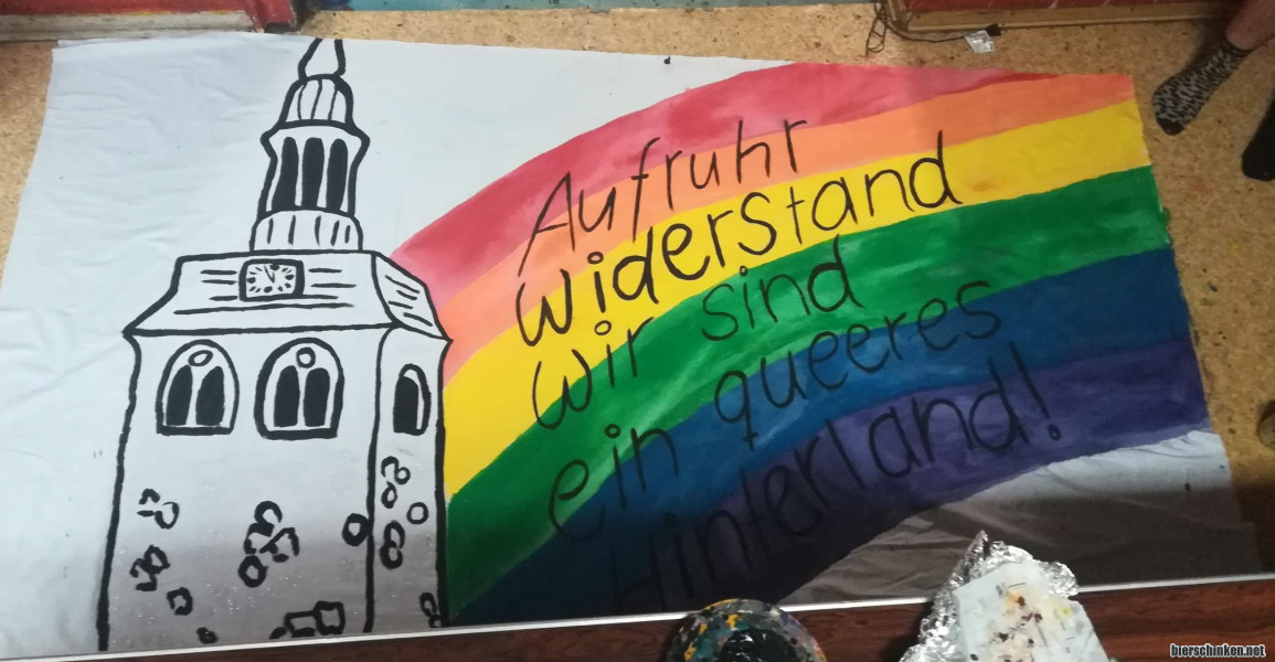Eins von mehreren Transpis. Gab mehrere schicke davon. Nicht erwähnt im Bericht wird die großartige Rapperin Faravaz, einfach, weil ich sie verpasst habe und sie netterweise auf einer trockenen, größeren Bühne spielen konnte, auch weil wir im Zeitplan mega hinterher hingen und unsere Bühne noch gar nicht startklar war... Aber vielleicht der Reihenfolge nach: