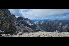 Hier nochmal ein kleines Foto vom Grat, den ich persönlich noch unheimlicher fand, als den Klettersteig, weil es hier ohne Sicherung auf jeder Seite mehrere hundert Meter in die Tiefe geht. Dafür ist die Aussicht aber mal der absolute Oberhammer. Auch wenn manchmal von Österreich her kalte Regenwolken reinwehen. Das wundert aber auch niemanden, so wie der Wind gerade aufdreht.