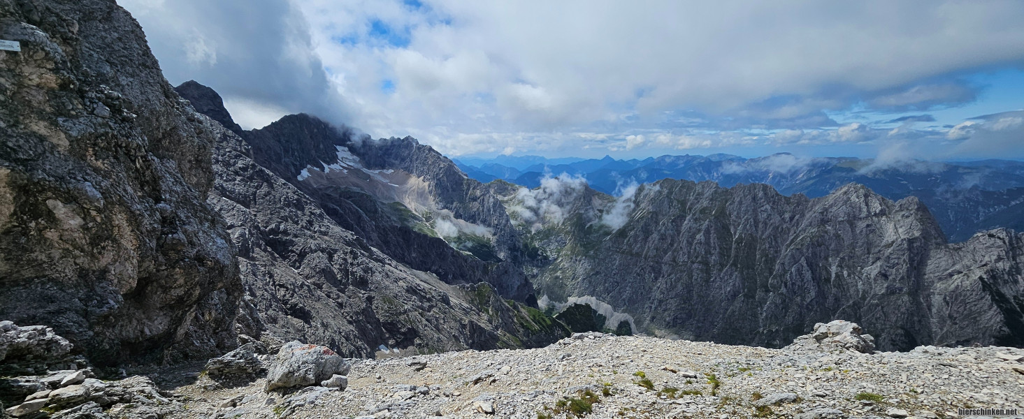 Zwen: Hier nochmal ein kleines Foto vom Grat, den ich persönlich noch unheimlicher fand, als den Klettersteig, weil es hier ohne Sicherung auf jeder Seite mehrere hundert Meter in die Tiefe geht. Dafür ist die Aussicht aber mal der absolute Oberhammer. Auch wenn manchmal von Österreich her kalte Regenwolken reinwehen. Das wundert aber auch niemanden, so wie der Wind gerade aufdreht.