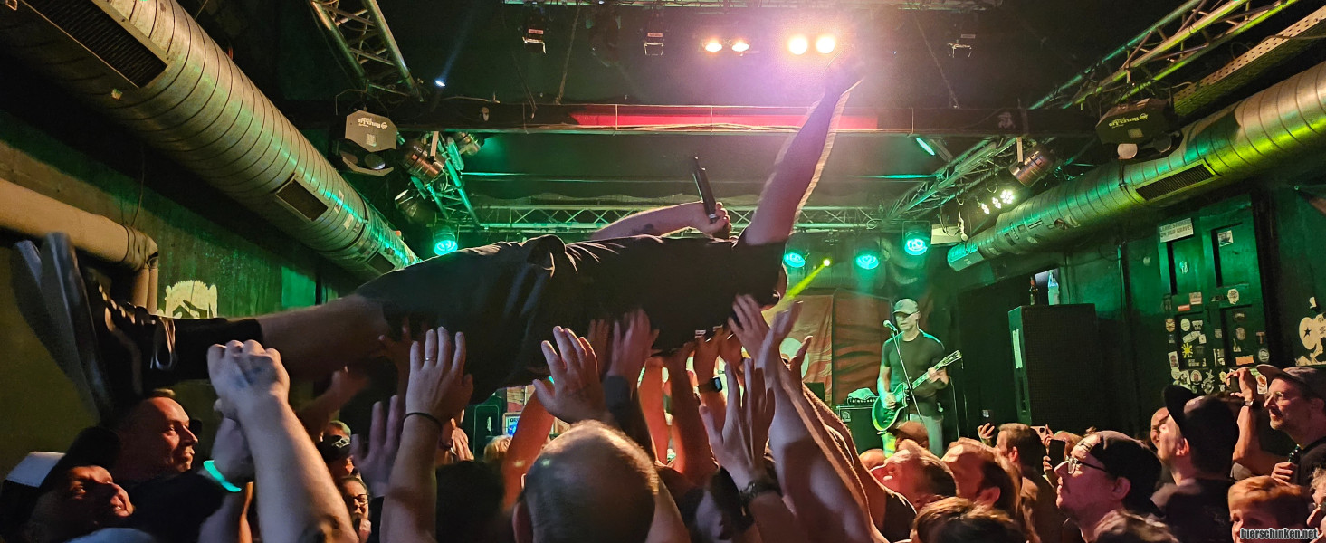 Der Sänger betreibt auch kräftig Stagediving. Dank Funkmikro ist das alles gar kein Problem und generell achten hier im AJZ auch wieder alle sehr vorbildlich aufeinander.