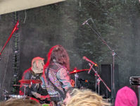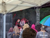 Leider geht während des Gigs der (zum Glück) einzige Regenschauer des Tages runter. Immerhin können die anwesenden Crusties dann mal duschen, obwohl der Trend anscheinend zum Regenschirm vor der Bühne geht.