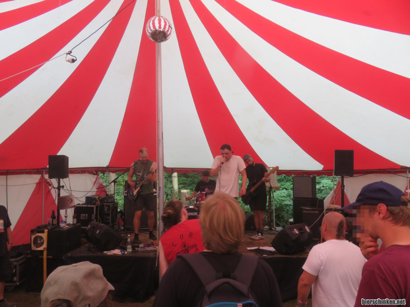 Fö: Plötzlich kommen dann doch Schrebber-Klänge aus dem Zelt. ah, das müssen jetzt also doch VOLLRAUSCHGUT sein! Der Weißbrotrapper brüllt jetzt, es gibt stumpfen Deutschpunk. Qualitativ natürlich auch nichts Überragendes, aber was soll ich sagen, bei Deutschpunk hab ich einfach keine Ansprüche. Find ich gut!