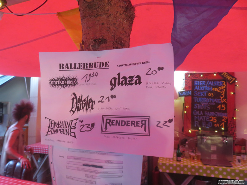 Fö: Achja, es gibt noch die geheime dritte Bühne: In der "Ballerbude", wo sonst das erwähnte Kino läuft, spielen auch noch Bands. Der Zeitplan dazu hängt heute aus, auch wenn sich daran nicht so ganz minutiös gehalten wird.