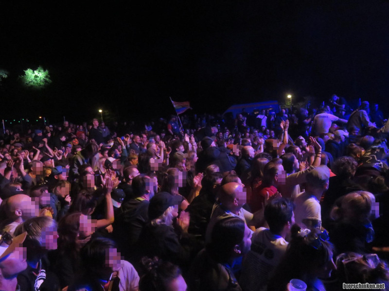 Oh, das gute alte Hinsetzen-und-Aufspringen-Spielchen. Nagut, das war dann wohl doch der Tiefpunkt vom Auftritt. Also, tief weil wegen sitzen und so, aber auch weil derlei Mitmachspielchen spätestens dann unangenehm werden, wenn nicht toleriert wird, dass es Leute gibt, die da nicht mitmachen wollen/können. Damit mein ich jetzt nicht die Band, aber einige im Publikum sollten sich vielleicht mal Gedanken über erzwungene Gruppendynamik machen. Aber das nur mal so am Rande.