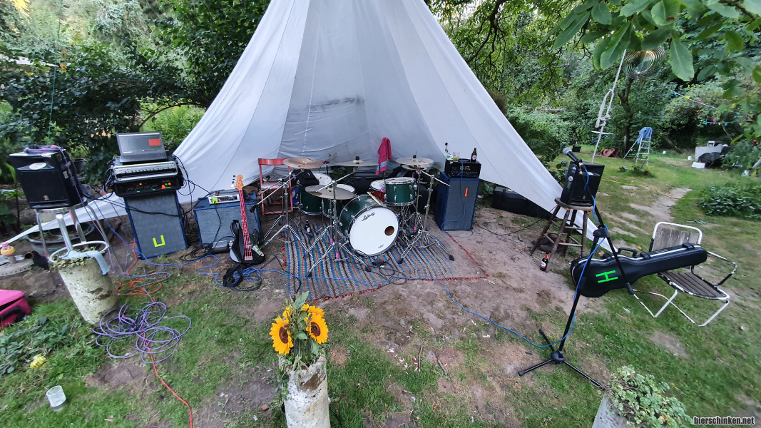 Wir spielen heute Freiluft, das Wetter spielt mit, einen mobilen Jacuzzi gibt es auch, sowie einen Pizzaofen draußen, Verpflegung jeglicher Couleur und reichlich Grünzeug.