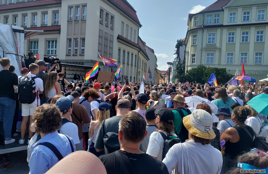 verSemmelt: 10.08. KRAFTKLUB und JELA J beim CSD in Bautzen. Spät angekommen gehen wir der Demoroute entgegen und sehen auf der Platte KRAFTKLUB, die so 8-9 Songs, darunter 2-3 neue Titel zum besten geben. Super angenehme Stimmung, wo es letztes Jahr noch arg problematisch war und ein paar Daumen hoch von Balkonen der Innenstadt zeugt davon, das "Browntown" noch nicht ganz verloren ist. Am Bahnhof spielt noch die Songwiriterin JELA J, von der ich nicht wirklich was mitbekomme. Erst nachdem jemand im Gespräch die Künstlerin erwähnt, nehme ich diese überhaupt wahr. Voll auf Durchzug... Die sächsische Polizei überzeugt derweil mit dem Code "SN 13/12".