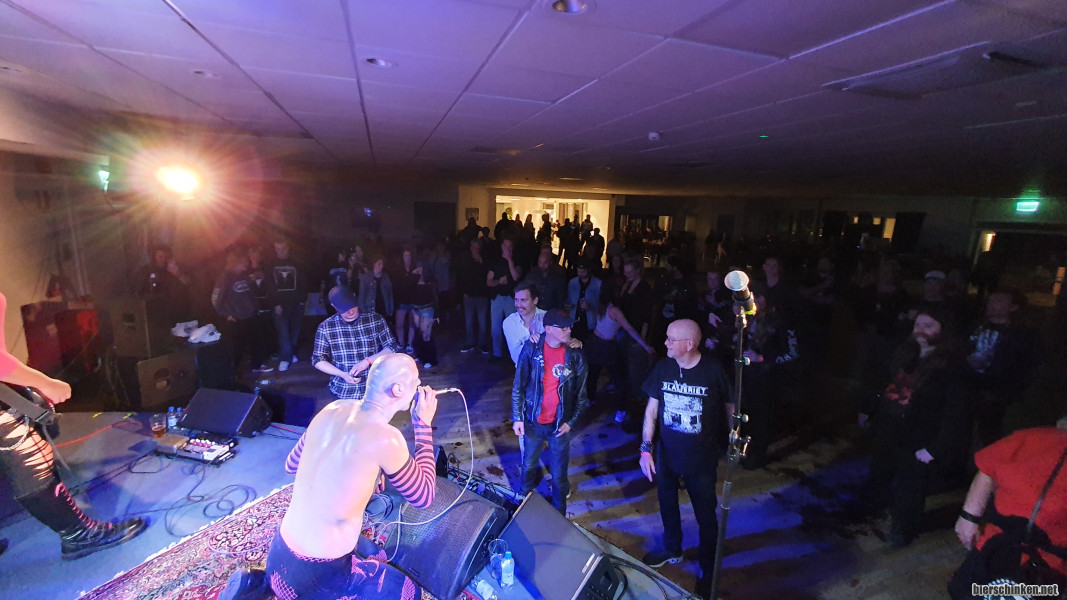 Das Foto spiegelt es nicht wieder, weil ich das in der "Pause" gemacht habe, wo Husi immer sabbernd/lallend über der Monitorbox hängt und den Mittelteil einläutet. Das Publikum hat dann eine Minute Zeit für Pippi, lecker Bierchen und Luft holen. Danach explodiert und eskaliert der Laden wieder und Menschen pogen, hüpfen und bangen sich die Seele aus dem Leib zu unserem Krach.