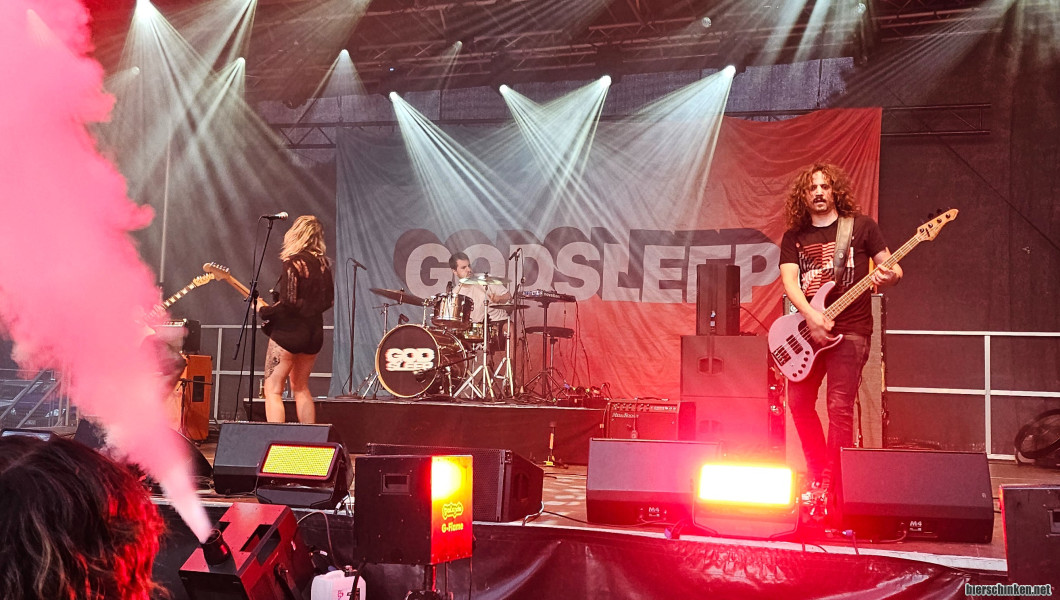 Zwen: Als nächstes dann GODSLEEP aus Athen. Die habe ich bereits vor zwei Wochen gesehen und ihr kompromissloser Stoner-Rock mit ordentlich Kante hat mich bereits auf dem Beach Bitch Rock komplett überzeugt. Heute ist das Ganze nochmal eine Spur druckvoller und die Nebelmaschine (diesmal ohne Seifenblasen) und die Flammenwerfer (waren die gerade im Angebot?) tun ihr übriges. Außerdem fällt mir auf, wie unglaublich talentiert die Musiker*innen sind und damit meine ich nicht nur die unglaubliche musikalische Vocal-Range der Sängerin, sondern auch die frenetisch mit den Fingern geklampften Basslines.