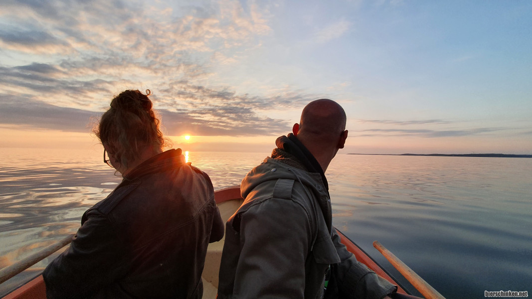 Wir machen uns am letzten Abend noch die Füße nass und fahren bis zum Sonnenuntergang auf den riesigen See raus und genießen neben der Ruhe ausnahmsweise auch mal ein lecker Bierchen dabei. Mhmmmmm.