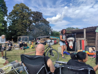 Schnell zu Tag 2. Frühstück als auch anderes Tagesfood gibt´s u.a. von Zittau vegan. Die besten Kartoffelecken Südbrandenburgs machen nebenan die Einheimischen. Versorgung also tippitoppi. Wir schlendern noch etwas durch den Wald, wo etwas Pilzfood für die heimische Küche und Schimpagners Geigerzähler zu finden war.
