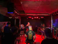 Als wir reinkommen, spielt dann auch die Supportband bereits. TEXAS TOAST CHAINSAW MASSACRE. Da ich es nicht wusste, hier die Ergebnisse meiner Recherche, was ein Texas Toast ist: ein Toastbrot mit Knoblauchbutter, gegrillt/geröstet. Also: Lieblingsmahlzeit aller Leute, die ich kenne! Stark!