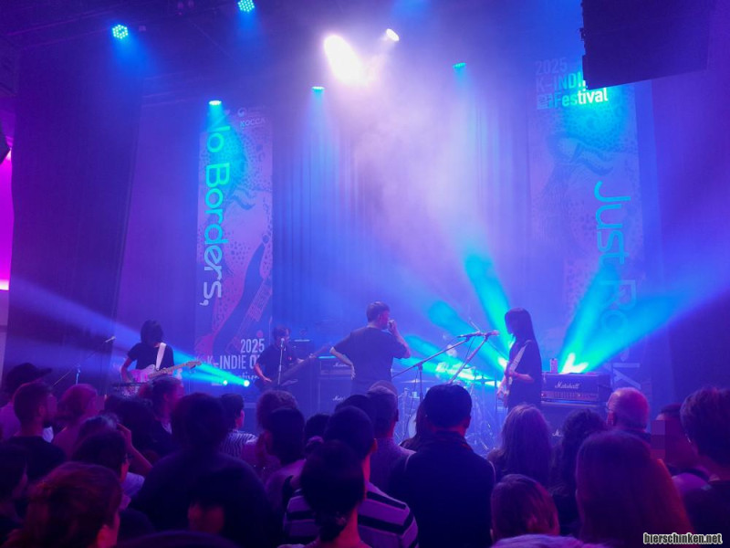 Der erste von den wahnsinnig effektiven Umbauten dauert nur so ca. 15 Minuten. Das wird auch bei den anderen Bands nicht länger werden. Ein Mann mit Funkgerät treibt den Umbau voran, während sich DABDA (다브다) aus Seoul schon warm soundchecken. Sie entschuldigen sich dafür, spielen aber hier schon komplizierten Kram mit einer Souveränität, dass es wirkt, als machen sie das eigentlich nur kurz, um die Wartezeit zu überbrücken.