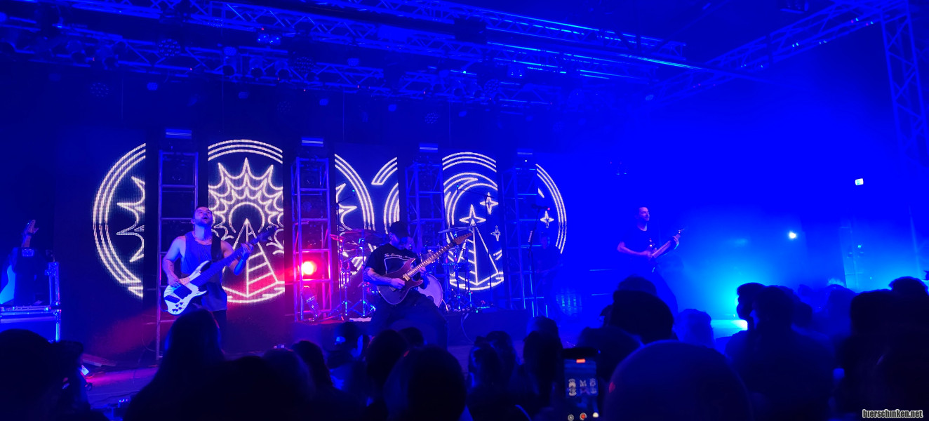 In der großen Halle geht es weiter mit INTERVALS, meine Mitstreiter sind heiß wie Frittenfett. Die Band hat relativ offensichtlich einen Haupt-Protagonisten, der singt und Gitarre spielt, letzteres ziemlich technisch versiert, schnell und sehr "modern". Ich kannte vorher vielleicht ein, zwei Lieder, die mehr so Richtung Animals as Leaders gehen, aber das meiste erinnert mich doch eher an Computerspielmusik aus den 80ern, es ist unglaublich viel los und ein Wust an Melodien, super hektisch.
