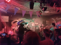 FAINE PINKL wird anmoderiert mit frühere Linkin Park Coverband aus Esslingen und andere Merkwürdigkeiten. Das muss rauskommen wenn man eine KI halluzinieren lässt. Nach einem Auftritt in Halle ist das jetzt der dritte Gig der Hallenser und/oder Hoyerswerdaer Band?!? Direkt im ersten Song wird schon mal gekonnt Sachsendreck gedisst und outfittechnisch gewinnt man mit Hochzeitskleid am Schlagzeug natürlich auch. Für Abwechslung sorgen Wechsel der Instrumente und 3 der 4 haben sich auch am Mikro versucht. Musik? Chaotischer Punk vielleicht? Da ist auch mal ein Inferno dabei, was kaum die 15 Sekunden überschritten haben sollte. Ansonsten klingen irgendwann die Rückkopplungen so, als hätten sich beide Bands gegenseitig manipuliert, damit schön Feedback durch den Raum scherbelt. Als Gimmicks gibt's ein Banner mit "Sachsen Whack stinkt" und gekaufte Konfettikanonen. Der stärkere Heimvorteil lässt FAINE PINKL knapp siegen.