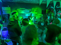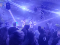 Erstmal ist Bandbattle angesagt. Der Gewinn ist die Auswahl des Outfits der jeweilig unterlegenen Band. Jeweils zwei halbe Sets und beginnen dürfen oder müssen SACHSENDRECK, die ich mir in meiner limitierten Fantasie schon in Bermudashorts und Hawaiihemden vorstelle. Wahrscheinlich weil hier schnell die Temperaturen im tanzwütigen Publikum stiegen. Bei der augenzwinkernd parteiischen ModeratorIn kommen sie schon mal etwas schlechter weg. Als Gimmicks wurde ein Polizeiauto gebastelt und etwas Konfetti mitgebracht. Es kommt ein Set, das ich so ungefähr schon mal gehört habe.