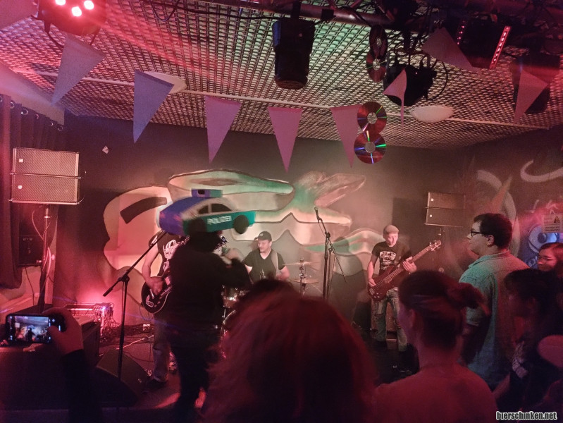 Erstmal ist Bandbattle angesagt. Der Gewinn ist die Auswahl des Outfits der jeweilig unterlegenen Band. Jeweils zwei halbe Sets und beginnen dürfen oder müssen SACHSENDRECK, die ich mir in meiner limitierten Fantasie schon in Bermudashorts und Hawaiihemden vorstelle. Wahrscheinlich weil hier schnell die Temperaturen im tanzwütigen Publikum stiegen. Bei der augenzwinkernd parteiischen ModeratorIn kommen sie schon mal etwas schlechter weg. Als Gimmicks wurde ein Polizeiauto gebastelt und etwas Konfetti mitgebracht. Es kommt ein Set, das ich so ungefähr schon mal gehört habe.