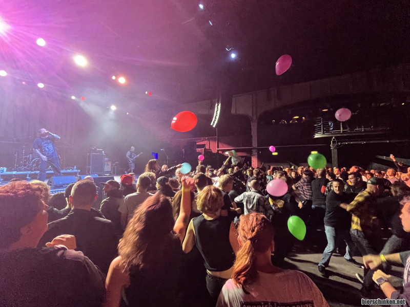 COMEBACK KID eröffnen zu A-HAs „Take on Me“. Das scheint irgendwie so ein Running Gag zu sein, dass HC-Bands heutzutage immer Pop-Samples in ihr Set einbauen, nagut. Auch CK schaffen es das Tempo der eher Core-lastigen Bands aufrecht zu erhalten. Wenn auch alles ein bisschen mehr im Old-School. Teilweise wirkt das schon ein bisschen nach Plattitüde was die Kanadier hier auf die Bühne bringen, trotzdem authentisch. Selbiges gilt für die Fans: Ein Typ neben mir trägt Bandana. Die Circle- und auch Mosh-Pits sind deutlich größer und länger als bei den vorherigen Bands. Weniger Verzweiflung, eher Angriff nach vorne… und Spaß! Irgendwann fliegen bunte Luftballons in den Pit und werden kurzerhand plattgetreten. Das Konzert rollt wie eine Dampfwalze durch den Saal und bei mir treten erste Ermüdungserscheinungen auf. Zum Ender „Wake up the Dead“ gebe ich nochmal alles. Danach muss ich mich setzen. Die schwitzenden Menschen um mich rum reiben sich die Schienbeine und Kiefer, sehen aber glücklich aus.