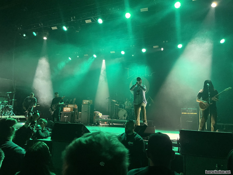 Das charaktertische DF-Schlagzeug prügelt laut, böse und… monoton! Zusammen mit Sänger Dereks Gesang entsteht dadurch das typische Grauen aus der provinziellen Einöde New Jerseys, häuslicher Gewalt und Kriegstrauma. Die Geschichte entfaltet sich heute punktuell in Klassikern wie „Living Hell“ und „Dear Father“. Bei „Empty Glass“ steht die Bühne still und Derek nimmt uns mit in seine Stammkneipe „The Copper Coin“, kein schöner Ort, aber die Menge fleht ihn an: „Tell me about the old days!“. Die Monotonie entlädt sich in einem fulminanten Gewitter aus (zu) grellen Lichtern, Post-Rock-Soundwalls und dem Kugelhagel des Drummers.