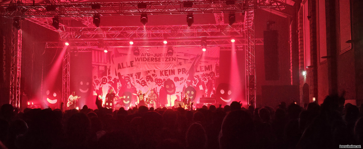 Musikalisch wird viel vom neuen Album gespielt, was jetzt nicht super überraschend ist und ja auch irgendwie Sinn macht. Leider fallen deswegen ein paar alte Knaller wie "Vorgesetzter" raus und dafür gibt es dann "Kaffee die Tage" zu hören. Naja, aus meiner Sicht nicht wirklich ein Hit, dafür haben alle bei "Mittelfinger" Spaß. Auch "Copkiller von Bodycount" und "Altbauwohnung" geht ganz gut rein, aber irgendwie habe ich das Gefühl, dass die neuen Sachen von Team Scheisse textlich noch ein bisschen mehr als die alten Songs, auf Wiederholung der immergleichen drei Wörter setzen, als das bereits zuvor der Fall war. Das ist schon frech!