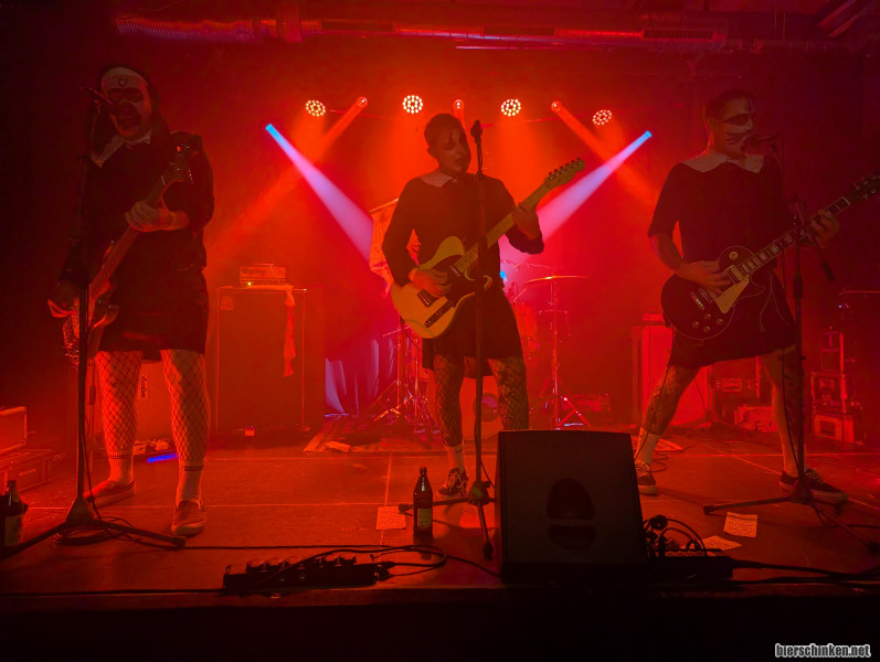 NOFNOG aus Saint Gallen präsentieren sich stilsicher im schwarzen Habit, den sie mit Netzstrumpfhosen kombinieren. Doch müssen sie sich irgendwann des Schleiers entledigen. Es ist ein bekanntes Problem, dass der beim Abrocken blöd ins Gesicht rutscht. Jedenfalls ist es mal wieder eine Freude, diesem feinen Hardcore Punk zu lauschen. Die Insomnia LP besteht nämlich ausschließlich aus "Bangers", wie Überyou-Ian sagen würde. Das macht selbst dem Bill Kaulitz Klon aus dem Publikum Feuer unterm Hintern, worauf er das Fliegen von der Bühne lernt.