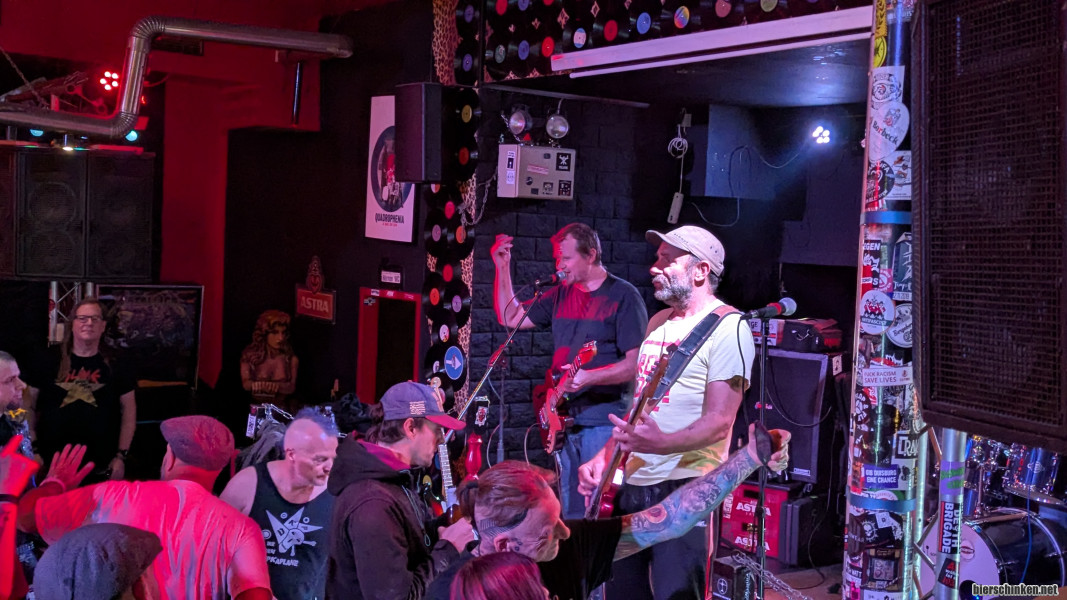 kiki: 17.10. KNOCHENFABRIK und FEINSTAUB WEST im Don't Panic in Essen. Beim Foto könnte mensch meinen, da stehen doch Chefdenker auf der Bühne. Aber Chris vertritt heute mal Hasan am Bass, der (laut Aussage der Band) "mal wieder" Vater geworden ist. Bierschinken gratuliert natürlich von Herzen. Ansonsten gibt es die gewohnte Palette an Knofa -Hits, wobei bei "Grüne Haare" das Bier fast bis in die erste Etage verspritzt wird. Den Altersschnitt senken die Jungspunde von FEINSTAUB WEST ein wenig, so dass alle Generationen gut gelaunt und betrunken nach Hause gehen.