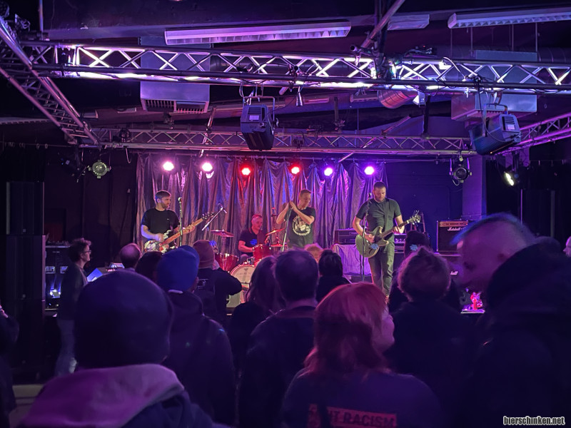 Burn: Wie der Name wohl sagt: Einfach gestrickter Punk-Rock. Ich glaube es geht textlich viel ums Saufen, und Feiern. Die von der Band spendierte Schnapsflasche rundet mein Bild ab. „Du hast dir den Beruf / Besuch selber ausgesucht“ ist der letzte Song. Ganz witzig. Die Hookline höre ich später noch gepfiffen auf dem Klo. Scheint gut angekommen zu sein. Insgesamt nicht so meins, aber ein guter Opener.