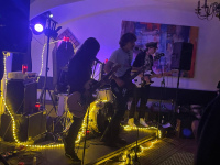 Die Cafébar, kurz CaBa ist eigentlich ein ungewöhnlicher Ort für Subkultur in Aulendorf. Normalerweise spielen im nahegelegenen irReal die Punkbands auf und im Café verweilen tagsüber Kurgäste und Rentner*innen, doch ich muss sagen: Top-Laden! Außerdem gehört er sowieso zum IrReal-Kosmos und könnte möglicherweise in Zukunft für noch mehr musikalische Szenetreffen sorgen. Auf dem Land in Oberschwaben sind unabhängige Undergroundkonzerte noch lange nicht tot. Im Gegenteil: Ich sichte mindestens 50% Menschen unter 30 (unverhohlen geschätzt), davon ein beachtlicher Teil Flinta-Personen. Bockstark!