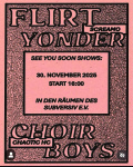 30.11. FLIRT, YONDER, CHOIR BOYS im Subversiv in Berlin. Matineekonzert, Sonntag 16 Uhr- I love it. Es wird gebrüllt, geschrien, geschrammelt, alle sind ganz entzückend zugänglich und etwas fertig vom Wochenende. Es ist fast zu schön um wahr zu sein. Und ich lerne den Kollegen Matsch kennen, sehr angenehm das...