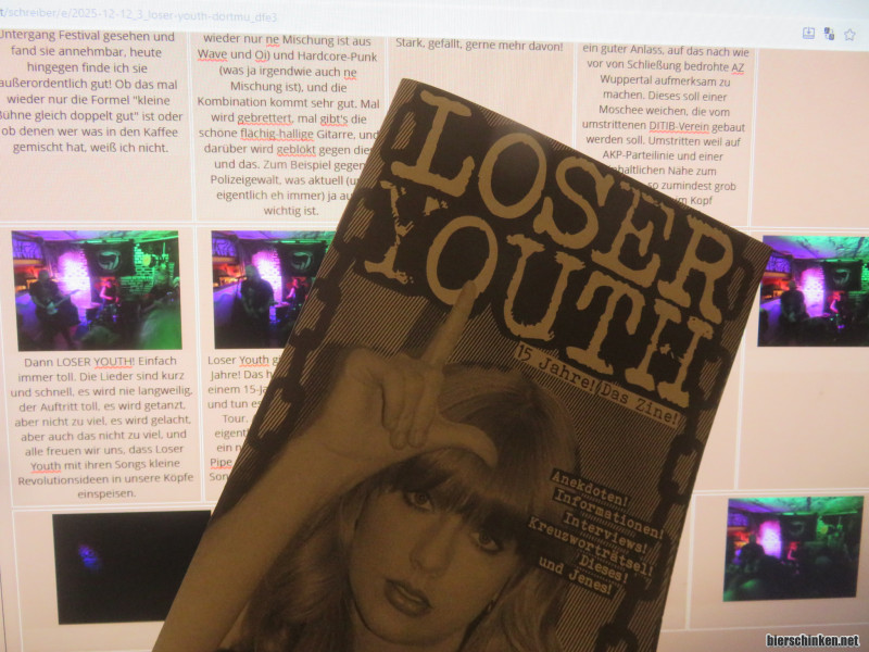 Kürzlich lag nämlich dieses Heft in meinem Briefkasten! "Loser Youth 15 Jahre! Das Zine!" steht drauf und ist ne absolute Empfehlung für alle, die gerne A5-Hefte mit 24 Seiten lesen. Schön bebildert und gelayoutet, schreibt die Band hier viel über sich selbst, führt aber auch Interviews (z.B. mit Rapha von Alarmstufe Gerd oder mit Tüddel von RilRec), die schönsten Orte der Welt werden vorgestellt und für alle Rätselqueens, -kings und -queers gibt es sogar ein Kreuzworträtsel! Großer Spaß für die ganze (Wahl-)Familie. Das Heft gibt es bei der Band, glaube ich.