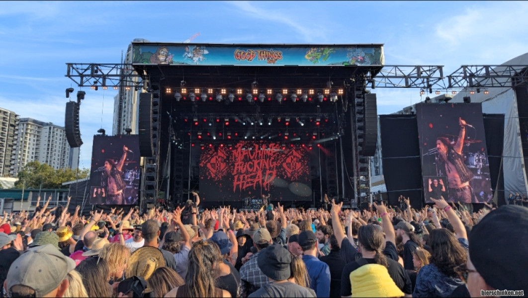 Walter: 7.12. Good Things Festival in Brisbane. Ein völlig lieblos veranstaltetes Riesenfestival. Sound war durchgehend mäßig. Bands waren dafür sehr gut. Am meisten hat mir CIVIC und HIGH VIS gefallen. Allerdings dachte sich der Veranstalter: lass uns die Bühne direkt vor einen Pfosten setzen der möglich mittig rechts völlig im Weg steht, anstatt die ganze Bühne 10 Meter weiter links aufzubauen. Naja. Ansonsten hab ich mir die letzte internationale Show von REFUSED angeschaut. Später noch mit denen gequatscht weil die bei CIVIC standen. Ansonsten gab's noch WARGASM, GWAR, MACHINE HEAD die auch zu dritt kräftig abgerissen haben, WEEZER, GARBAGE und zu guter Letzt TOOL um 20:15. Bei TOOL war das Publikum derart besoffen, dass man die erste Hälfte nur dummes Gelaber und Gepöbel gehört hat. Zweite Hälfte war dann besser, weil die gegangen sind. Hat trotzdem Spaß gemacht. Immer noch spannend, was der Drummer da so spielt. Nettes Festival, original Preis viel zu teuer. Umgerechnet 150€. 0,33L Dose Bier (medium strength, 3,5% Alkohol) 7€.