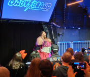 Das ganze Projekt Babybeard dreht sich um den australischen Wrestler, Crossdresser, Stuntman, Entertainer und Japan-Fan Richard Magarey aka Ladybeard. Unterstützt wird er dabei von Mizuki und Suzu am Gesang. Tatsächlich weiß ich nicht ganz, was ich vorab zu erwartet habe, aber als die Band zu dritt auf die Bühne geht, bin ich - auch wenn man es vorher hätte wissen können - doch einigermaßen überrascht, dass weit und breit kein einziges Instrument zu sehen ist. Außerdem ist die Musik relativ leise, weshalb ich direkt meine Ohrstöpsel rausnehme, was es ungefähr auf die Lautstärke eines Standard-Punkkonzerts mit Ohrstöpseln bringt, also eigentlich ganz angenehm.