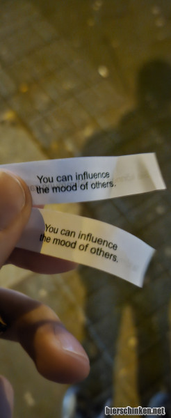 Bevor es aber aufs Konzert geht, gönne ich mir erstmal schön Thai-/Viet-Küche. Mir fällt immer wieder auf, wie viel geiler das Fressangebot in Städten wie Kölle oder Düsseldorf ist. Vor allem als Vegetarier ist es nämlich im Sauerland immer noch ziemlich Arsch. Nachdem ich mich ausführlichen am gut gewürzten (aber nicht scharfem) Curry gelabt habe, bekomme ich zum Abschied noch einen Glückskeks. Interessanterweise steht bei der deutschen "Übersetzung" auf der anderen Seite "Sie verbreiten gute Laune". Bin jetzt kein Glückskeks-Experte, aber ist das normal, dass die das so schwammig übersetzen?