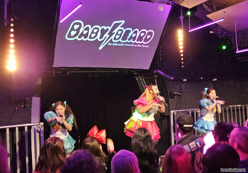 Das ganze Projekt Babybeard dreht sich um den australischen Wrestler, Crossdresser, Stuntman, Entertainer und Japan-Fan Richard Magarey aka Ladybeard. Unterstützt wird er dabei von Mizuki und Suzu am Gesang. Tatsächlich weiß ich nicht ganz, was ich vorab zu erwartet habe, aber als die Band zu dritt auf die Bühne geht, bin ich - auch wenn man es vorher hätte wissen können - doch einigermaßen überrascht, dass weit und breit kein einziges Instrument zu sehen ist. Außerdem ist die Musik relativ leise, weshalb ich direkt meine Ohrstöpsel rausnehme, was es ungefähr auf die Lautstärke eines Standard-Punkkonzerts mit Ohrstöpseln bringt, also eigentlich ganz angenehm.
